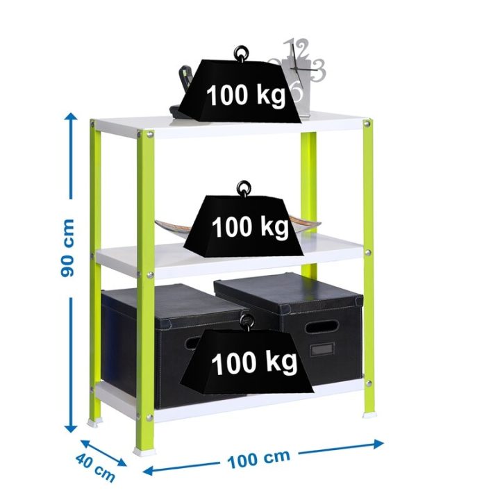 Es rigida. No necesita anclaje a la pared. Estanterías con tornillos avellanados con un mejor diseño. La manera más fácil y rápida de montaje. Estanterías con topes para no rayar el suelo. Capacidad de carga de 100 kgs por bandeja metalica. Montaje en menos de 9 min. Packagin con peso ligero. Gran variedad de colores Color del producto VERDE/BLANCO. Dimensiones 900x1000x400 . Nº estantes 3
