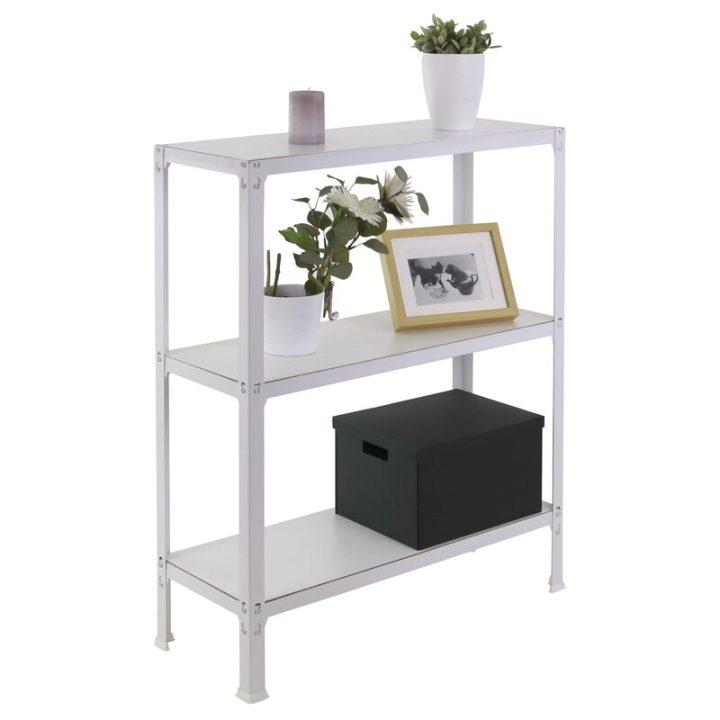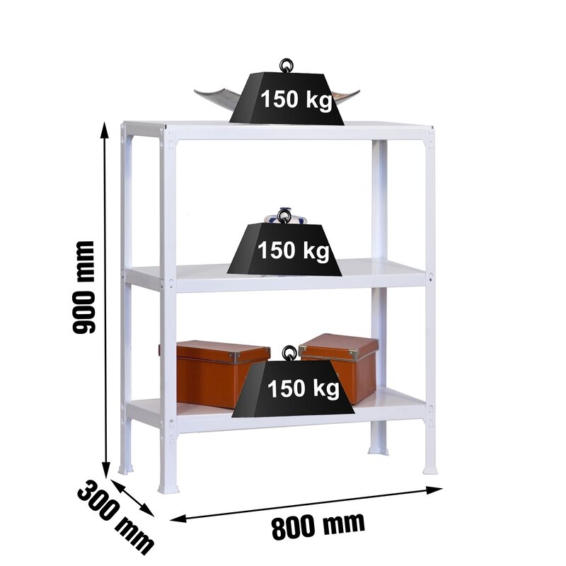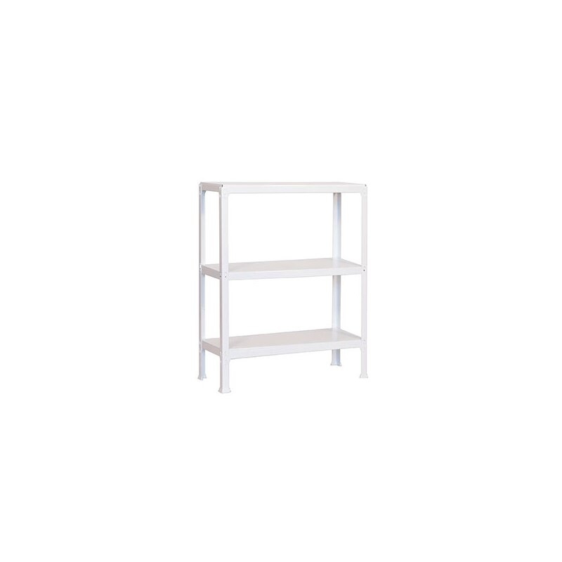 Es rigida. No necesita anclaje a la pared. Estanterías sin tornillos. La manera más fácil y rápida de montaje. Estanterías con topes para no rayar el suelo. Capacidad de carga de 150 kgs por bandeja metalica. Montaje en menos de 9 min. Packagin con peso ligero. Gran variedad de coloresColor del producto BLANCO. Dimensiones 900x800x300 . Nº estantes 3