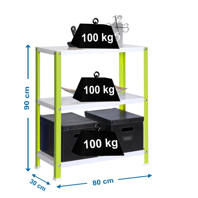 Es rigida. No necesita anclaje a la pared. Estanterías con tornillos avellanados con un mejor diseño. La manera más fácil y rápida de montaje. Estanterías con topes para no rayar el suelo. Capacidad de carga de 100 kgs por bandeja metalica. Montaje en menos de 9 min. Packagin con peso ligero. Gran variedad de colores Color del producto VERDE/BLANCO. Dimensiones 900x800x300 . Nº estantes 3