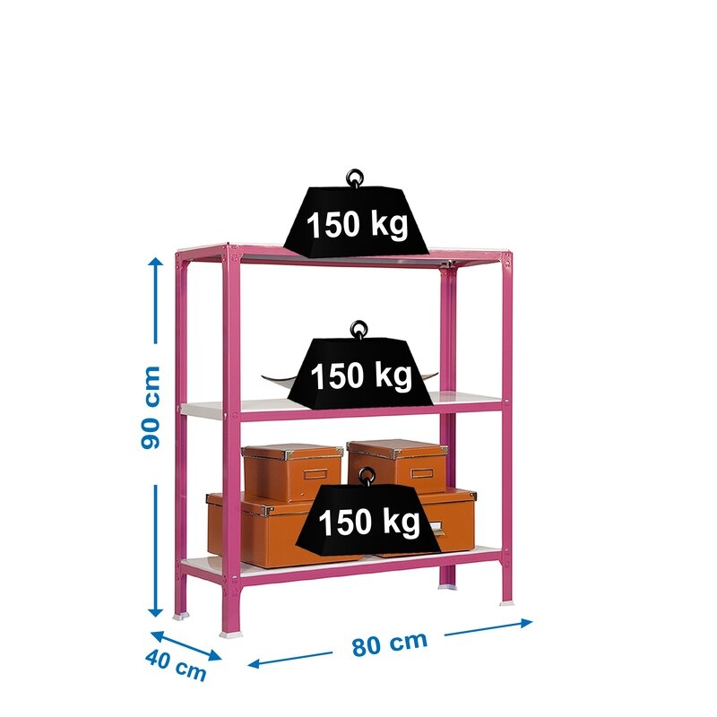 Es rigida. No necesita anclaje a la pared. Estanterías sin tornillos. La manera más fácil y rápida de montaje. Estanterías con topes para no rayar el suelo. Capacidad de carga de 150 kgs por bandeja metalica. Montaje en menos de 9 min. Packagin con peso ligero. Gran variedad de coloresColor del producto ROSA/BLANCO. Dimensiones 900x800x400 . Nº estantes 3
