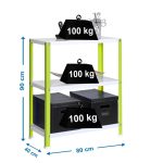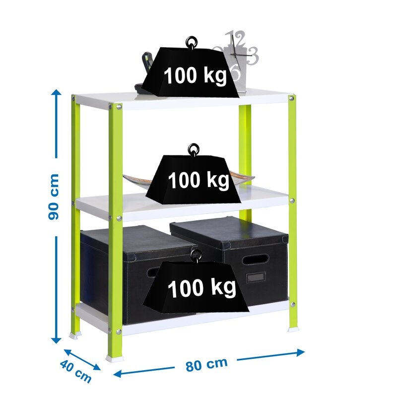 Es rigida. No necesita anclaje a la pared. Estanterías con tornillos avellanados con un mejor diseño. La manera más fácil y rápida de montaje. Estanterías con topes para no rayar el suelo. Capacidad de carga de 100 kgs por bandeja metalica. Montaje en menos de 9 min. Packagin con peso ligero. Gran variedad de colores Color del producto VERDE/BLANCO. Dimensiones 900x800x400 . Nº estantes 3