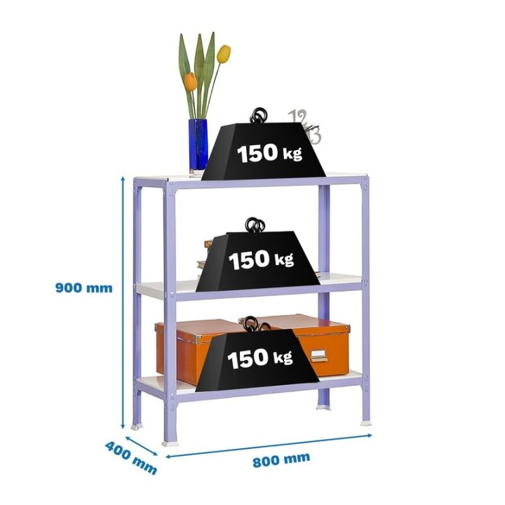 Es rigida. No necesita anclaje a la pared. Estanterías sin tornillos. La manera más fácil y rápida de montaje. Estanterías con topes para no rayar el suelo. Capacidad de carga de 150 kgs por bandeja metalica. Montaje en menos de 9 min. Packagin con peso ligero. Gran variedad de coloresColor del producto VIOLETA/BLANCO. Dimensiones 900x800x400 . Nº estantes 3