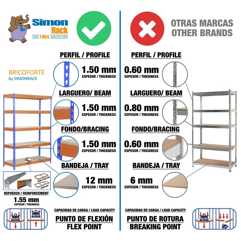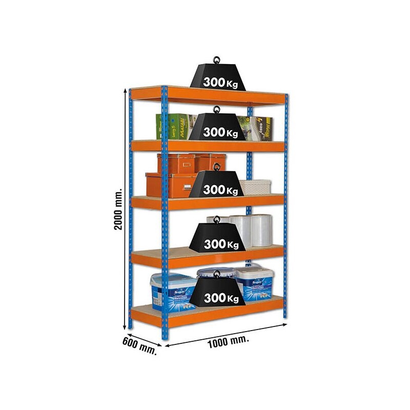 Estantería metálica sin tornillos con bandeja de madera, de color AZUL/NARANJA/MADERA.Tiene 5 estantes. Las dimensiones de esta Estantería son: 2000x1000x600 mm. Y tiene una capacidad de carga de 300 kgs. Estantería rígida, no se tambalea y no necesita anclaje a la pared. Es fabricado en España y se monta rápido siguiendo las instrucciones.