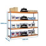 Estantería media carga sin tornillos Ecoforte 2000x1200x750 mm. De color AZUL/NARANJA/GALVA. La capacidad de carga es de 400 kgs.