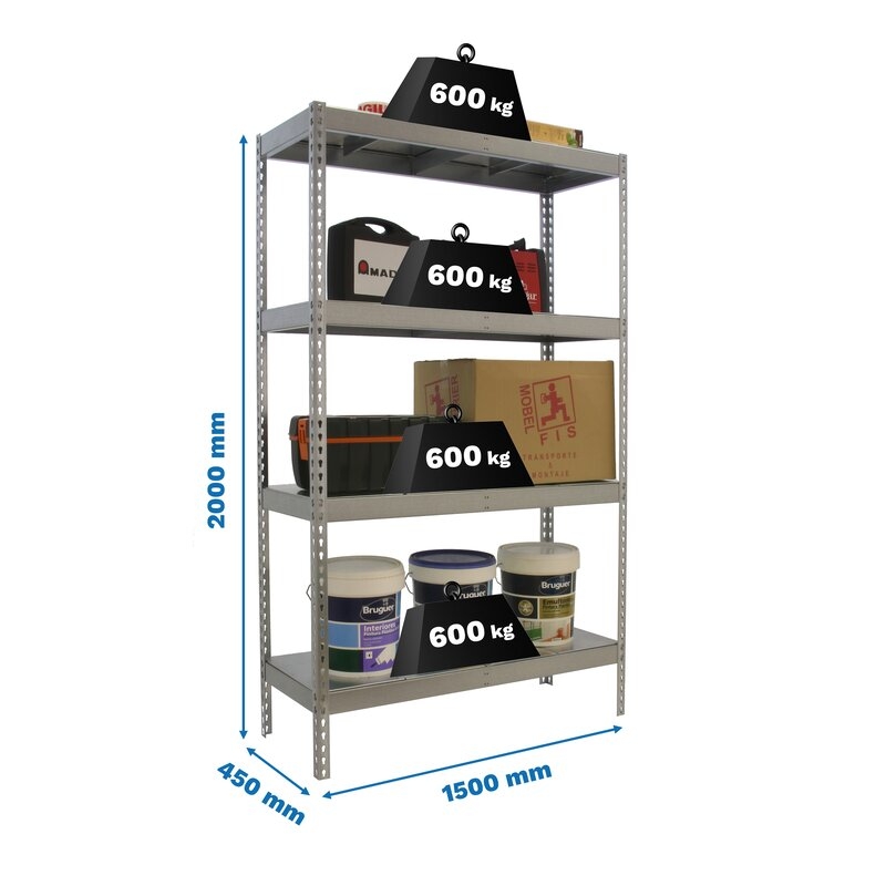 Estantería media carga sin tornillos 2000x1500x450 mm. De color GALVA/GALVA. La capacidad de carga es de 600 kgs.