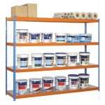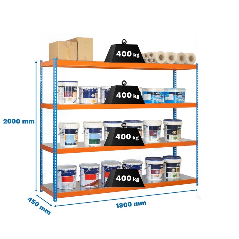 Estantería media carga sin tornillos Ecoforte 2000x1800x450 mm. De color AZUL/NARANJA/GALVA. La capacidad de carga es de 400 kgs.
