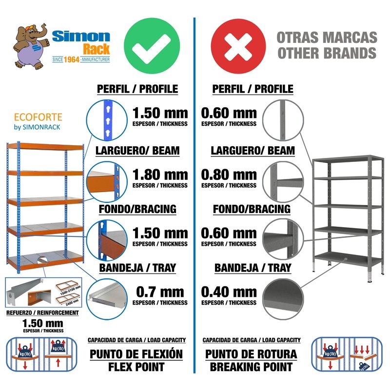Estantería media carga sin tornillos Ecoforte 2000x1800x750 mm. De color AZUL/NARANJA/GALVA. La capacidad de carga es de 400 kgs.
