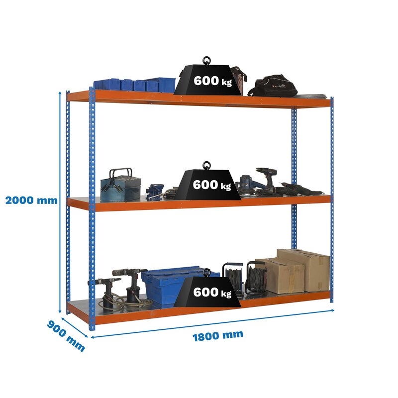 Estantería media carga sin tornillos 2000x1800x900 mm. De color AZUL/NARANJA/GALVA. La capacidad de carga es de 600 kgs.