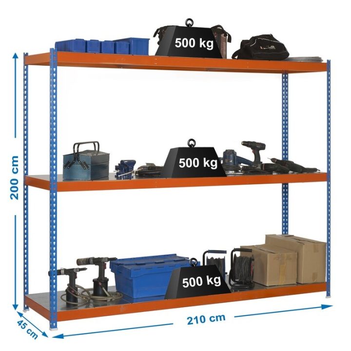 Estantería media carga sin tornillos 2000x2100x450 mm. De color AZUL/NARANJA/GALVA. La capacidad de carga es de 500 kgs por estante.