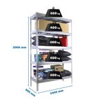 Estantería media carga sin tornillos 2000x2400x900 mm. De color GALVA/GALVA. La capacidad de carga es de 400 kgs.