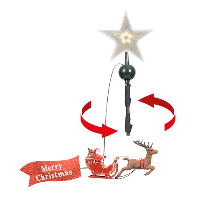 Esta estrella está fabricada en polipropileno y metal. Incluye un Papa Noel que está sentado en un trineo que va girando alrededor del árbol. La estrella incluye 5 Led de 3/V/10mA y se alimenta mediante un adaptador que viene incluido. La estrella tiene un tamaño de 22x8xh.51 cm y el alambre donde va colgado el Papa Noel es de 55 cm de largo.