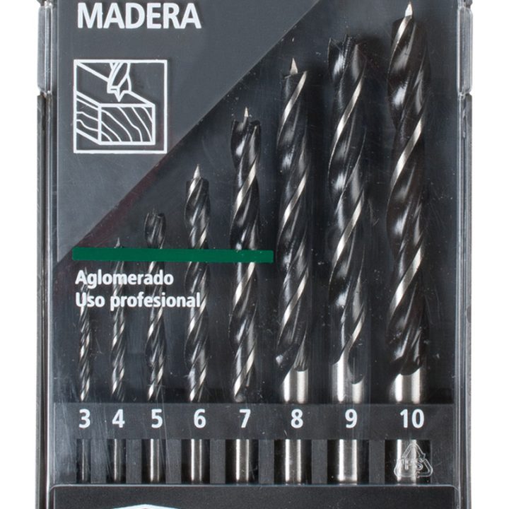 Juego de 8 brocas surtidas de diferentes diámetros: 3-4-5-6-7-8-9-10 mm. Todas las brocas cuentan con punta de centrado para una mayor precisión, y ofrecen excelentes resultados en todo tipo de maderas, ya sean duras, blandas, contrachapados, aglomerados, etc. Se presenta en una caja y su envase es un práctico estuche de plástico.