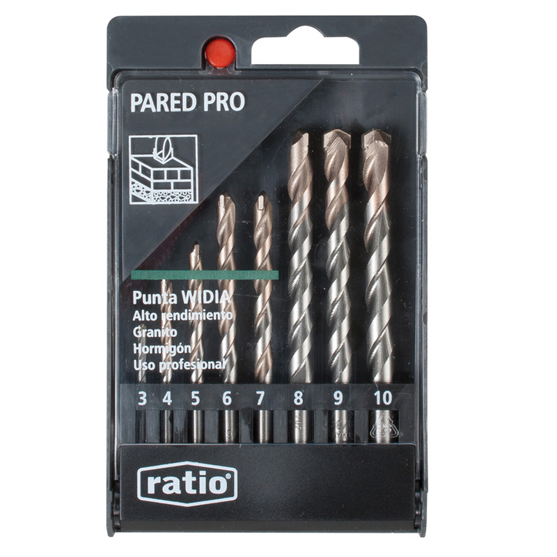 Juego de 8 brocas surtidas de diferentes diámetros: 3-4-5-6-7-8-9-10 mm especialmente diseñadas para uso profesional. Todas las brocas cuentan con punta de carbono de tungsteno y DIN 8039. Ofrecen excelentes resultados en el taladro de paredes y se presentan en un práctico estuche de plástico.