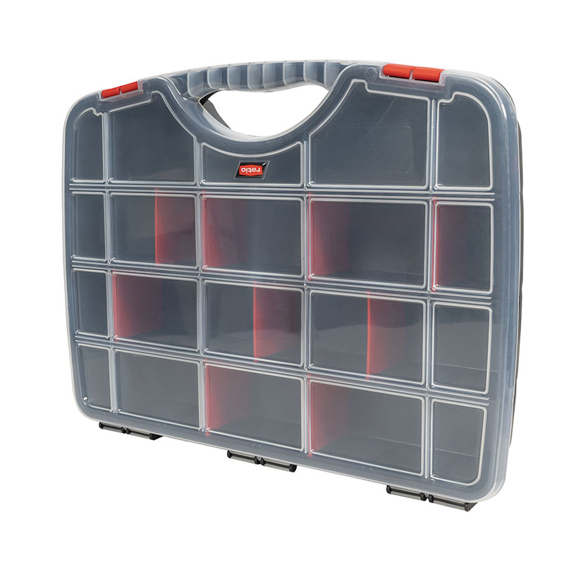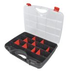 Este estuche está fabricado en poliestireno de alto impacto en España. Dispone de cantos redondos, una tapa transparente y un asa para su fácil transporte. Está compuesto por 21 separadores removibles para más comodidad.