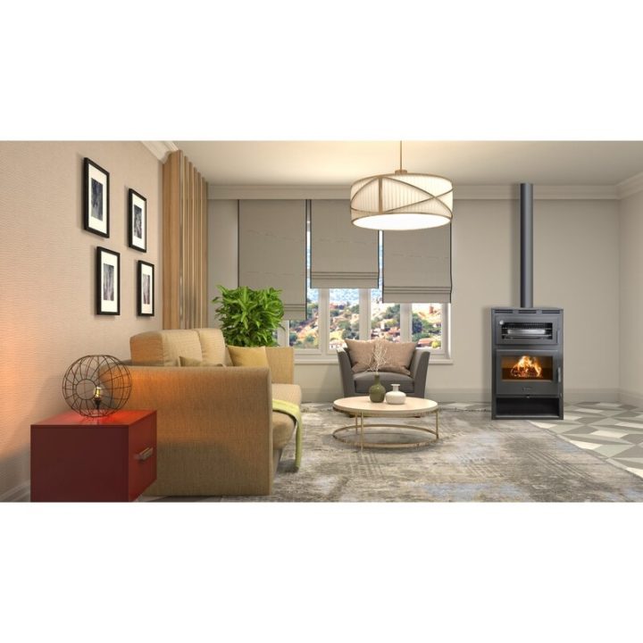 Estructura de acero con acabado de pintura anticalórica. Posibilidad de captar el aire comburente del exterior. Control de aire primario. Entrada de aire secundario posterior. Visión Panorámica. Hogar de vermiculita de alta densidad. Triple combustión.Sistema de cristal limpio. Cristal cerámico resistente a 750º. Cenicero extraíble. Posibilidad de carga de leña de 55cm. Horno de gran capacidad con base de ladrillo refractario. Incluye parrilla y bandeja. Incluye 2 turbinas. Termostato de seguridad. 2 velocidades