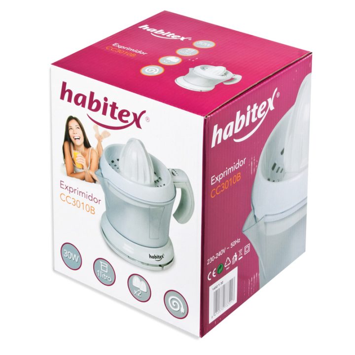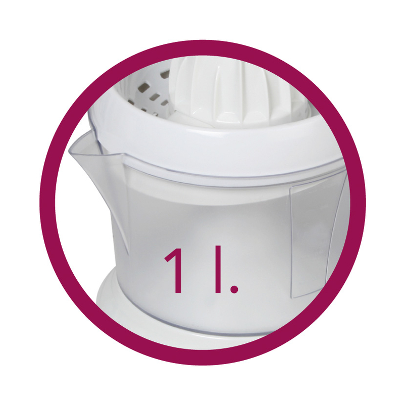 Este utensilio no puede faltar en tu cocina. Podrás disfrutar de zumos naturales en cualquier momento del día. Incorpora un regulador de pulpa para evitar grumos en tus zumos. Es desmontable para facilitar su limpieza, dispone de giro en ambos sentidos. Tiene una capacidad de 1 litro. Incluye como accesorios una tapa protectora, dos conos intercambiables y un recogecables incorporado. Tiene 3 años de garantía.