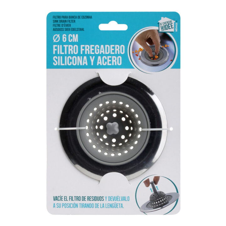 Este filtro para fregadero está fabricado en silicona y acero inoxidable. Es flexible e higiénico se adapta a la mayoría de los fregaderos estándar. Se vacía tirando la lengüeta hacia arriba para volver luego a su posición inicial. Viene presentado en un blíster.
