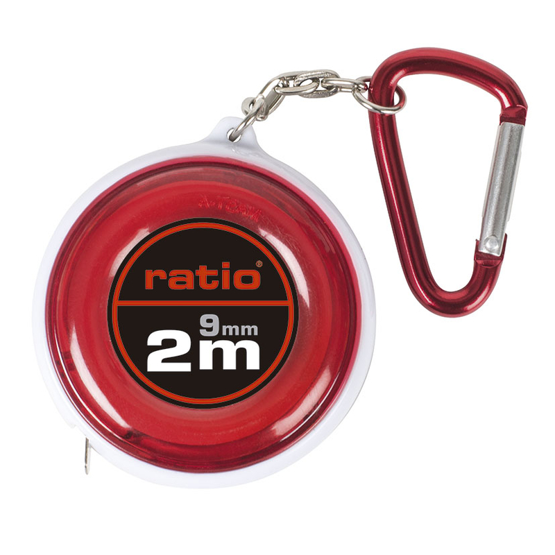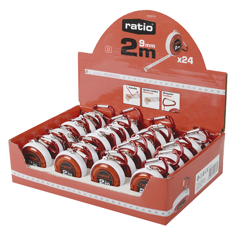 Su carcasa blanca confeccionada en ABS y laterales de policarbonato transparente le otorgan una alta resistencia. Tanto la cinta de acero de 2 m de longitud x 9 mm de ancho, como su revestimiento antireflex y su gancho metálico incorporado, fomentan la practicidad y eficacia de este instrumento. Incluye un mosquetón de aluminio anonizado en color rojo que te permitirá utilizar el flexómetro como un llavero, pudiendo colgarlo donde precises, de manera rápida y fácil. Este modelo no dispone de freno, cuenta con clase de precisión II y homologación CE. Se presenta en una caja display de 24 unidades.