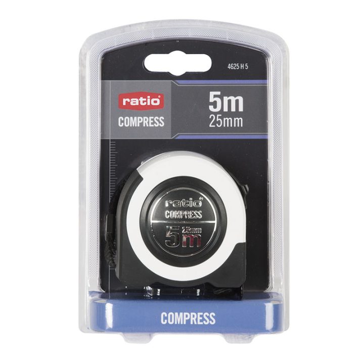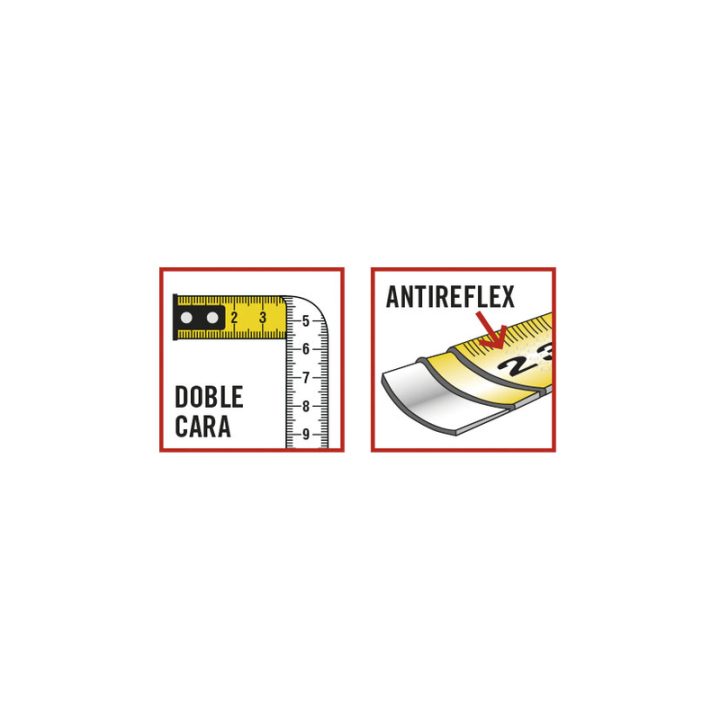 Este flexómetro de la serie Compress, viene en una resistente carcasa ABS antigolpes que dispone de un recubrimiento contra deslizamientos. El flexómetro está numerado a ambos lados, (cara amarilla/cara blanca) lo que facilita el trabajo de medición y tiene un revestimiento de nilón antireflex que le proporciona una mayor protección y durabilidad. Dispone de un gancho reforzado para mediciones precisas; clip para colocar en el cinturón de herramientas y un sistema de bloqueo automático. Es un producto fabricado en cumplimiento de la normativa vigente y está homologado por la CE. Clase de precisión II. Se presenta en doble blíster.