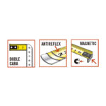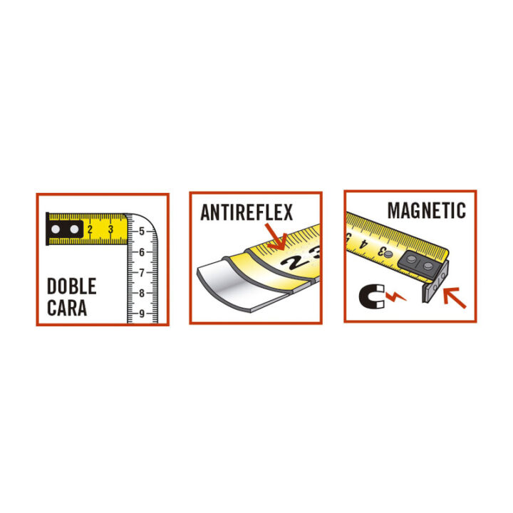 Este flexómetro de la serie Protect Pro Magnetic viene en una resistente carcasa ABS antigolpes que dispone de un recubrimiento contra deslizamientos. El flexómetro está numerado a ambos lados, (cara amarilla/cara blanca) lo que facilita el trabajo de medición y tiene un revestimiento de nilón antireflex que le proporciona una mayor protección y durabilidad. Dispone de un gancho reforzado magnético para poder colocarlo en cualquier superficie metálica y realizar mediciones precisas; clip para colocar en el cinturón de herramientas y un sistema de bloqueo automático. Es un producto fabricado en cumplimiento de la normativa vigente y está homologado por la CE. Clase de precisión II. Se presenta en doble blíster.