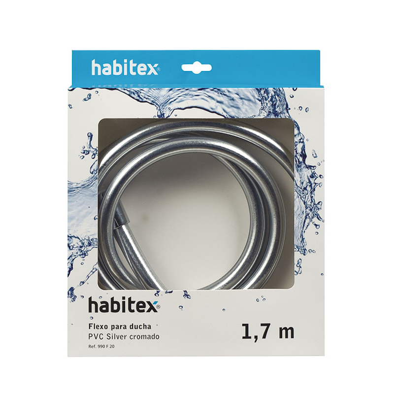 Este flexo de ducha está fabricado en PVC plateado cromado. Su longitud es de 1,70 metros y Viene presentado en una caja.