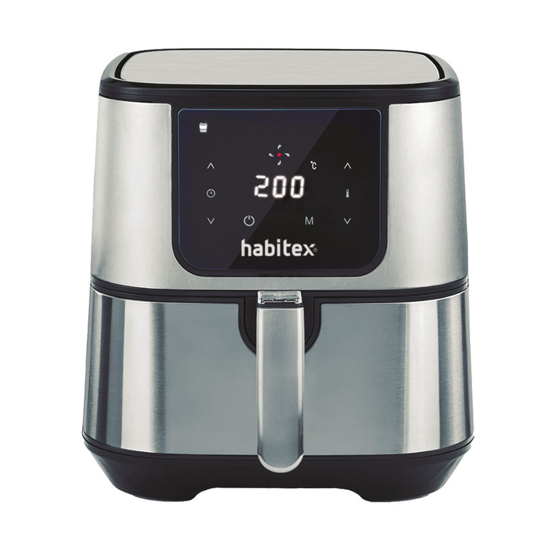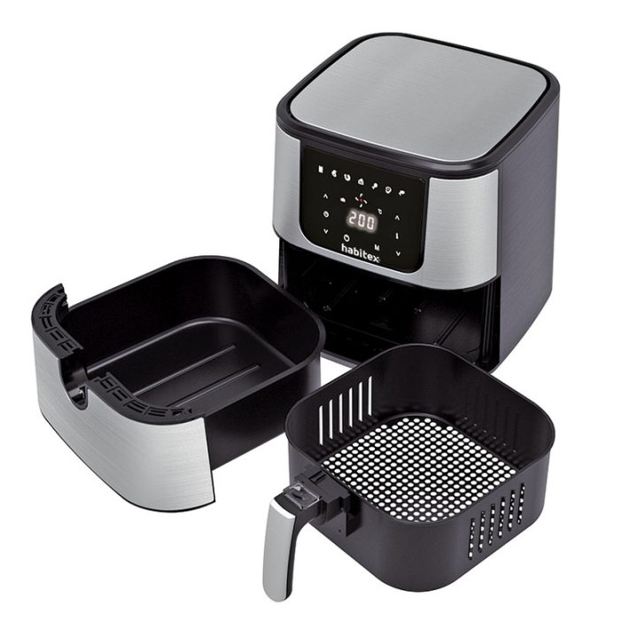 La freidora de aire HABITEX CC485D tiene una potencia de 1300/1500W funciona mediante una tecnología 360º circulación de aire ultra-rápida aportando unos resultados crujientes y deliciosos de forma saludable y sin aceite. Viene equipada con un panel digital en el que puedes seleccionar uno de los 7 programas para que puedas cocinar lo que precises en cada momento. Además de freír, es ideal para cocinar y asar alimentos frescos y congelados por convección, como un horno. Puedes seleccionar la temperatura desde 80-200ºC. Dispone de temporizador de 60 minutos, apagado automático, protección sobrecalentamiento para una mayor seguridad e incluye pies antideslizantes para una buena estabilidad. Con esta freidora obtendrás una serie de ventajas que te detallamos a continuación: economizarás el consumo de aceite, cocinarás los alimentos con menos grasas, evitarás el olor del aceite frito en tu hogar y podrás limpiarla con mayor facilidad. Además, dispone de una cesta antiadherente libre de BPA con capacidad de 5,5 l y el mango es de tacto frío.