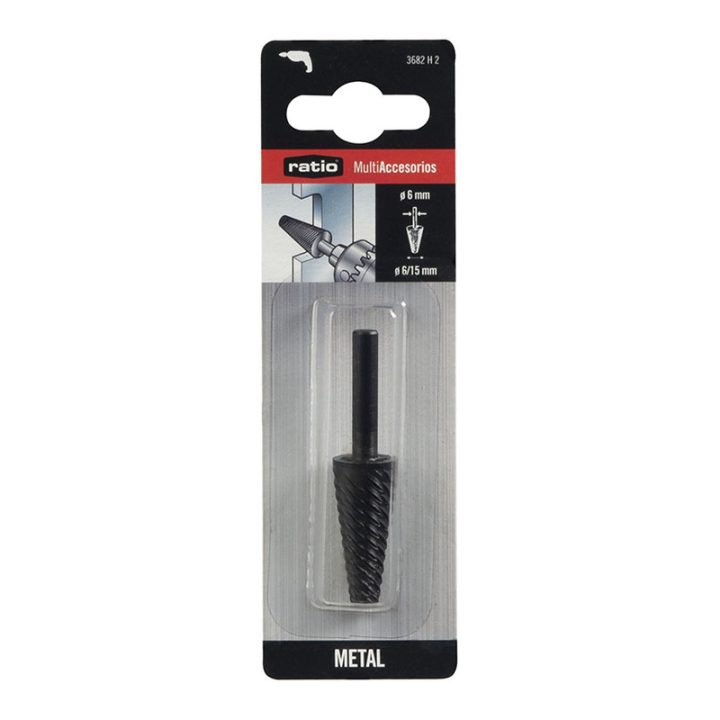 Esta fresa metálica de 6/15 mm de diámetro, con forma cónica y vástago de 6 mm, resulta idónea para trabajos en metal. Se presenta en un blíster.