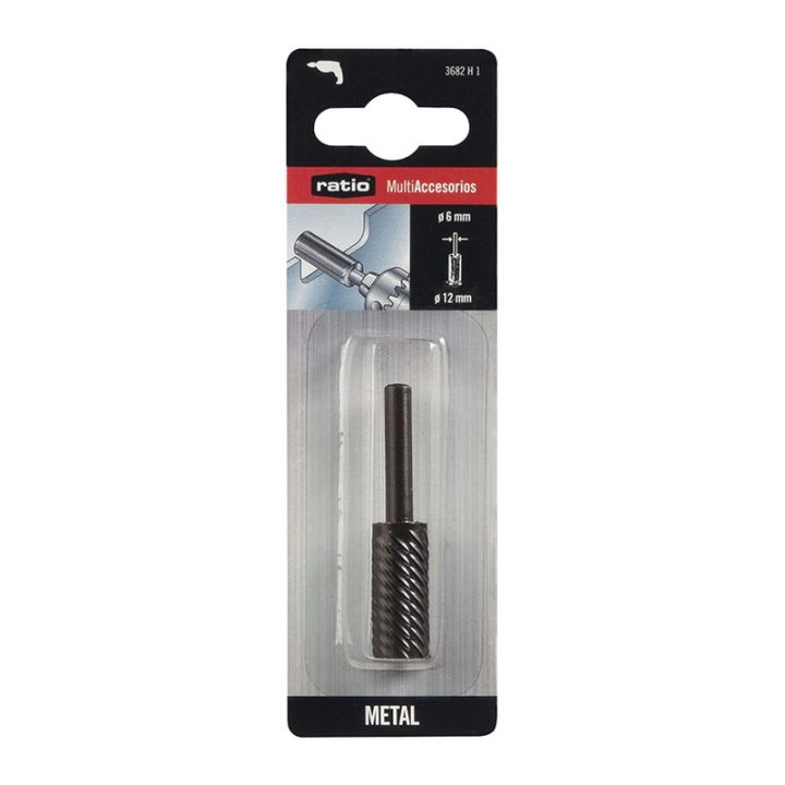 Esta fresa metálica de 12 mm de diámetro, con forma cilíndrica y vástago de 6 mm, resulta idónea para trabajos en metal. Acoplable a taladros. Se presenta en un blíster.