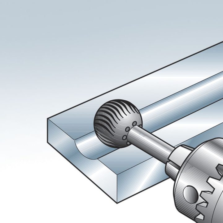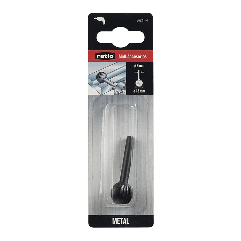 Esta fresa metálica de 15 mm de diámetro, con forma esférica y vástago de 6 mm, resulta idónea para trabajos en metal. Acoplable a taladros con 3000 rpm. Se presenta en un blíster.