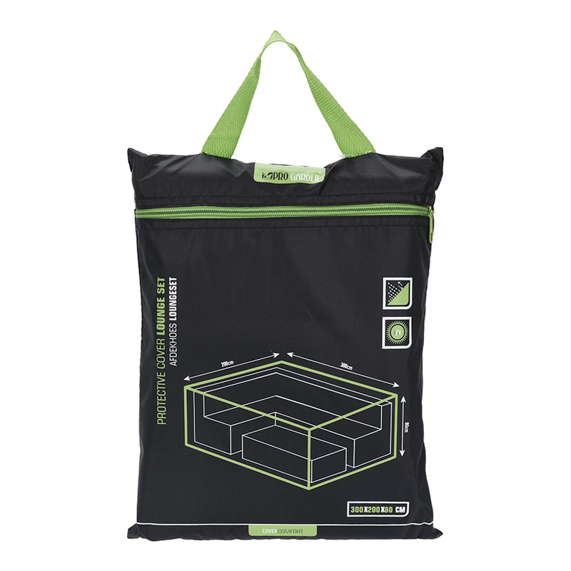 Este funda está fabricada en en poliéster de color negro. Es impermeable y resistente para todo tipo de clima. Tiene unas medidas de 300x200xh.80 cm y se presenta en una bolsa para su transporte.