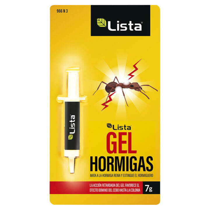 La jeringa de 7 gr hace una acción retardada del insecticida LISTA GEL HORMIGAS que favorece un efecto dominó sobre las hormigas de la colonia: después de la ingesta las hormigas regresan al hormiguero donde comparten el cebo con los otros miembros de la colonia (trofalaxia) hasta la reina, causando la muerte por auto-envenenamiento. Se sirve en un blíster.