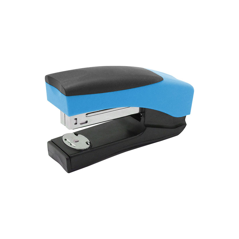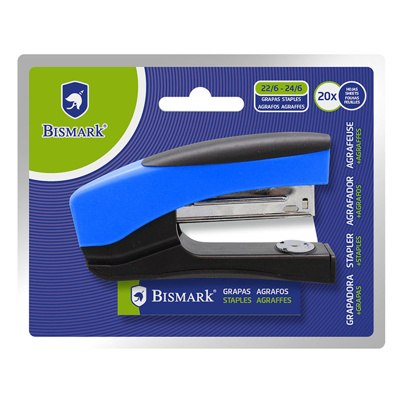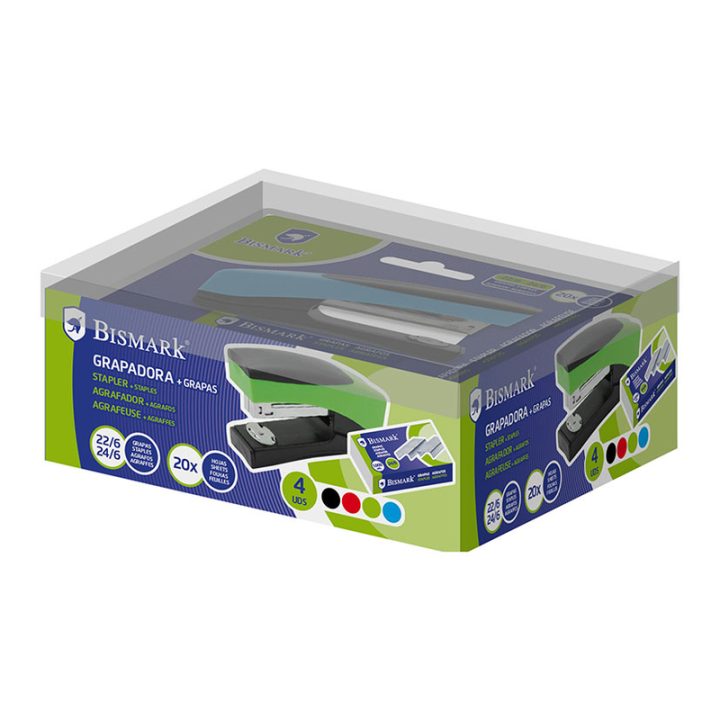 Esta grapadora está fabricada en plástico y metal que incluye una carga de 1.000 grapas. Está disponible en colores surtidos y tiene unas medidas de 10x3xh.5,5 cm. Viene presentado en blíster.