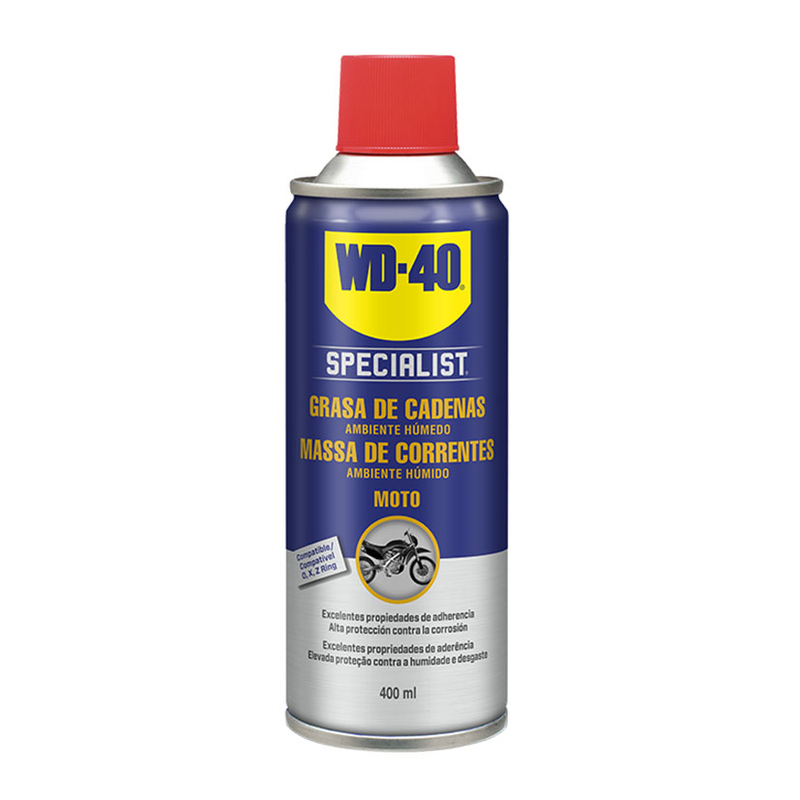 La Grasa de Cadenas WD-40 Specialist Moto, gracias a su excepcional protección contra la corrosión y al PTFE añadido, es particularmente adecuado para condiciones húmedas y aporta sobresalientes propiedades anti-goteo y de adherencia a la cadena.