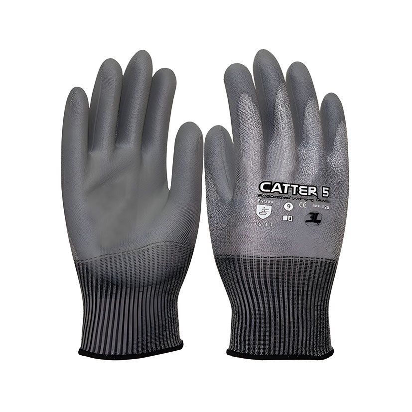 Poliéster/fibra de vidrio, sin costuras con recubrimiento de PU en la palma. Color gris. Alta resistencia al corte, abrasión y desgarro. Excelente agarre en seco y húmedo. Uso: automóvil, vidrio, reciclado, embotellado y envasado, etc.