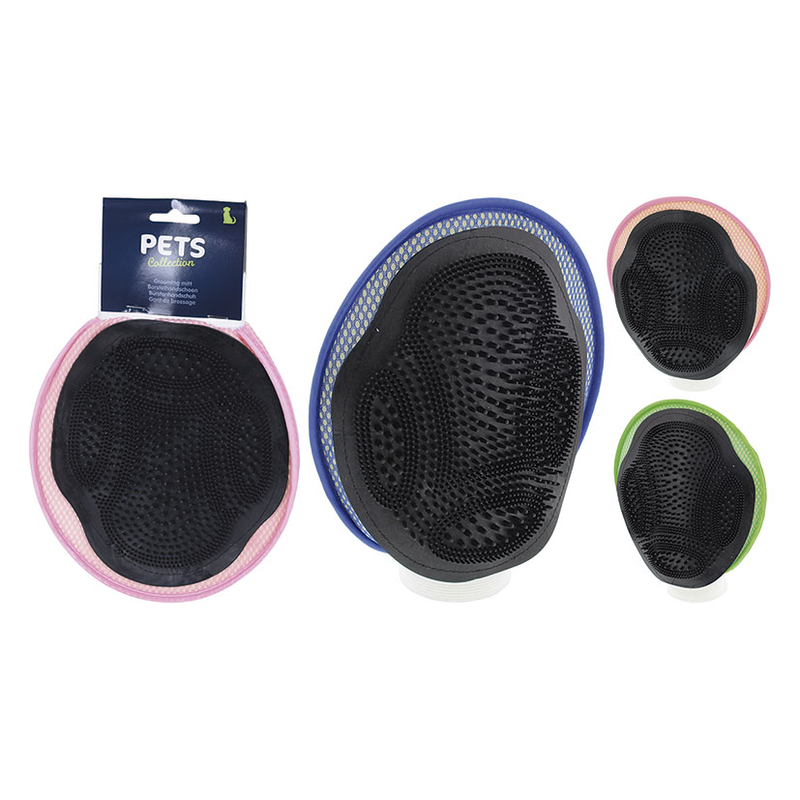 Con este guante o manopla a parte de cepillar a tu mascota, podrás dar un estimulante masaje al mismo tiempo que lo bañas. Dispone de cerdas de silicona y velcro ajustable en la mano. Lo podrás limpiar fácilmente y tiene unas medidas aprox. 12,8 x 8,7 cm. Se sirve en colores surtidos.