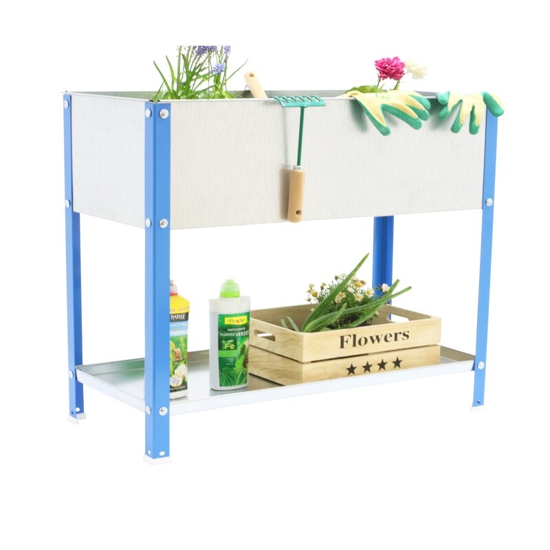 Huerto metalico rigido -Tiene una capacidad de 150 litros. Dispone en la parte inferior de una bandeja metalica para almacenar herramientas u objetos de jardin. Ideal para personas que desean disfrutar de un huerto en su casa y no disponen de todo el espacio que le gustaría. Montaje con tornillos. Huerto en casa para toda la familia. Montaje aprox. 9 mint .Color del producto AZUL/GALVANIZADO. Dimensiones 850x1200x400. Nº estantes 2
