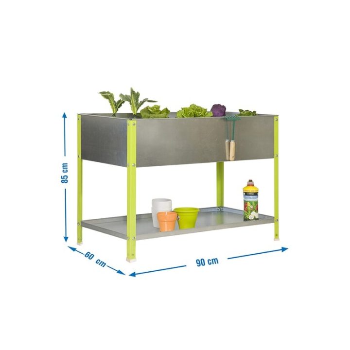 Huerto metalico rigido -Tiene una capacidad de 140 litros. Dispone en la parte inferior de una bandeja metalica para almacenar herramientas u objetos de jardin. Ideal para personas que desean disfrutar de un huerto en su casa y no disponen de todo el espacio que le gustaría. Montaje con tornillos. Huerto en casa para toda la familia. Montaje aprox. 9 mint .Color del producto VERDE/GALVANIZADO. Dimensiones 850x900x600 . Nº estantes 2