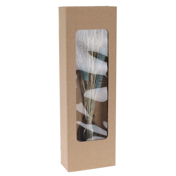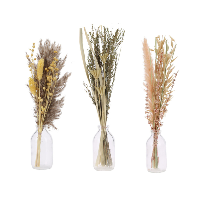 Este jarrón en forma de botella está fabricado en cristal transparente. Dispone de flores secas que servirán para una bonita decoración durante cualquier época del año. En el rincón donde lo quieras colocar crearás una atmósfera acogedi¡ora y rústica. El jarron tiene unas dimensiones de ø 12 x 36,5 cm.