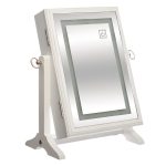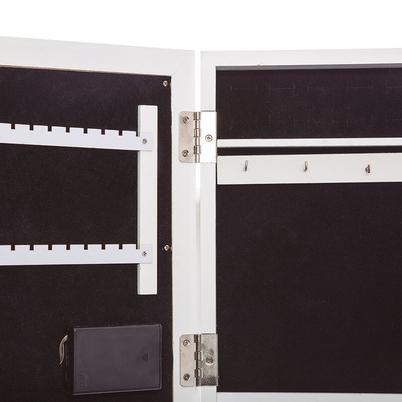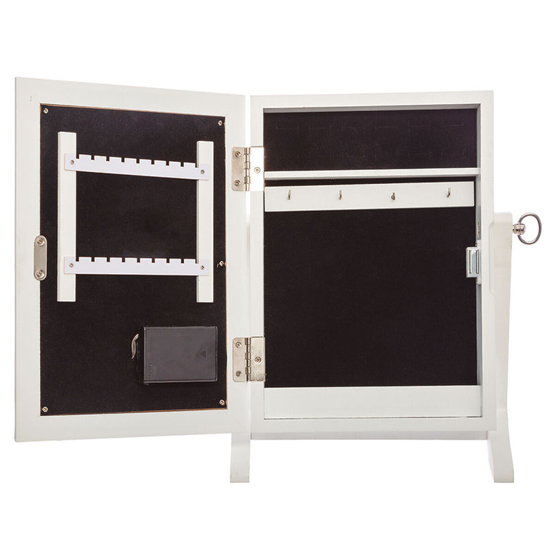 Este joyero tiene un diseño exclusivo, está fabricado en madera blanca y dispone de un espejo en con lud Led en la parte frontal. Lo puedes colocar en cualquier superficie de pie y en su interior guardar tus joyas. Te sirve para decorar cualquier rincón con encanto. Funciona con 3 pilas de tipo LR06 AA. También es una idea de regalo. Se presenta en una caja.