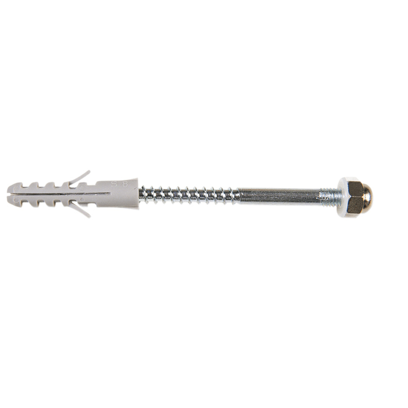 Juego de 2 tornillos con tuercas, arandelas y tacos S8 fabricados en acero cincado. Fácil Se presenta en cajas de 10 unidades.