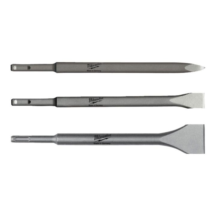 Juego de 3 piezas MILWAKEE especialmente indicado para martillos electroneumáticos. Los cinceles tienen una longitud de 250mm. Se compone por: