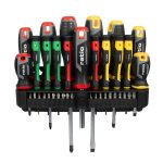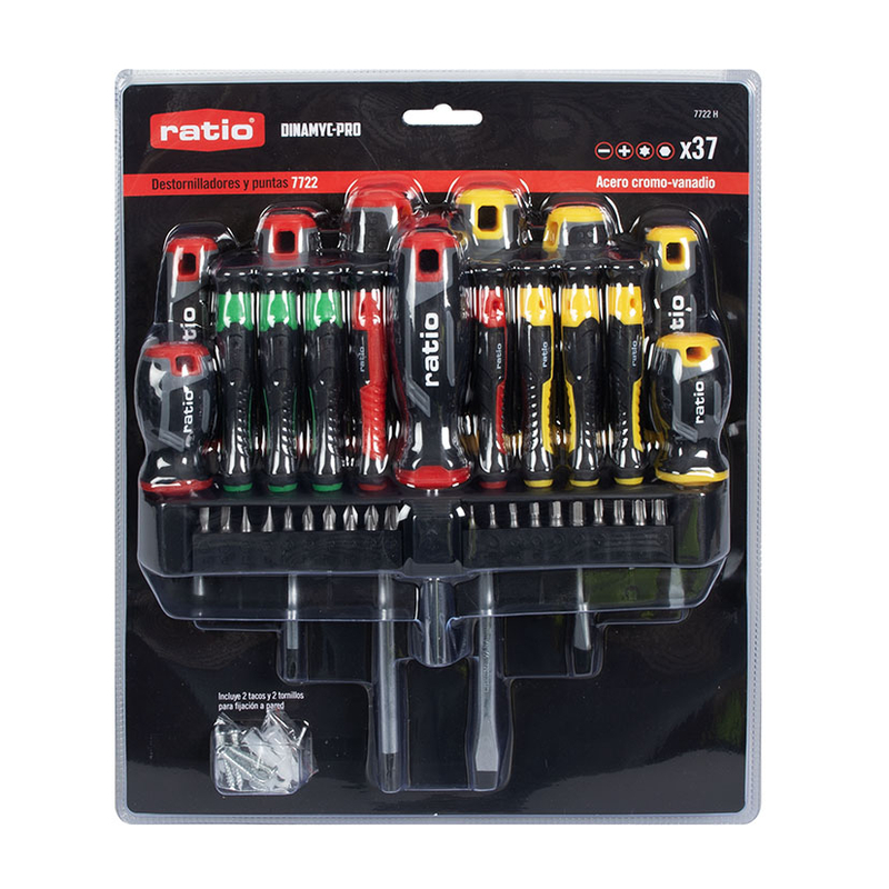 El set de destornilladores y puntas de atornillado RATIO Dynamic es perfecto para quienes buscan calidad, comodidad y una amplia gama de opciones en un solo paquete, asegurando un rendimiento excelente en cualquier tarea. Los mangos son antideslizantes, trimaterial magnético para un agarre cómodo y firme. Las varillas son de acero Cromo-Vanadio para mayor resistencia y durabilidad. Incluye un soporte a pared de plástico que facilita el almacenamiento ordenado y el acceso rápido a las herramientas.