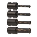 Este juego de 4 brocas con anclaje M14, para anclar directamente en miniamoladoras. Ha sido desarrollado para perforar materiales de alta dureza como el gres, baldosas, piedras naturales, porcelana, fundición o fibra de vidrio donde es complicado trabajar con el resto de brocas convencionales. Además, te garantizan el máximo rendimiento y durabilidad en materiales muy duros. No precisa de refrigeración con agua, raliza agujeros limpios y sin descantillados ni roturas.