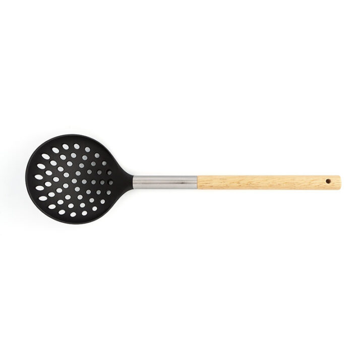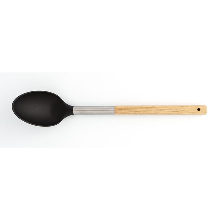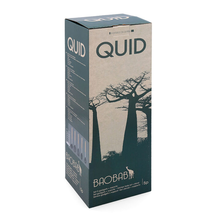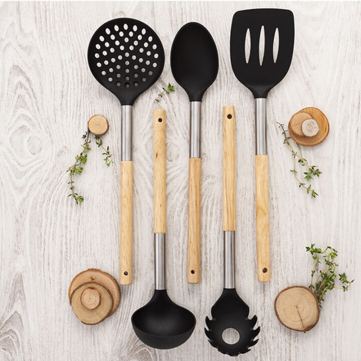 Este juego de 5 utensilios de cocina está compuesto por una base en acero inoxidable y 5 utensilios: 1 cazo 1 espátula, 1 espumadera, 1 cucharón y 1 cuchara espaquetti; tienen el mango en madera Baobab, africana, acero inoxidable y la parte inferior en un material que no raya la superficie donde estés cocinando.