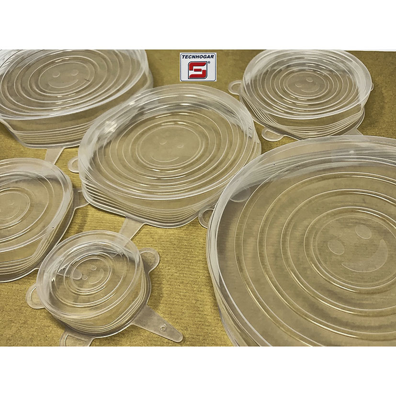 Juego de 6 tapas redondas de silicona resistente al calor libres de BPA y con la certificación FDA yLFGB. Las tapas son reutilizables y fácilmente almacenables. Está compuesto por diferentes diametros: 6,4/9,1/11,2/13,9/15,7 y 19,5 cm. Se presenta en una caja.