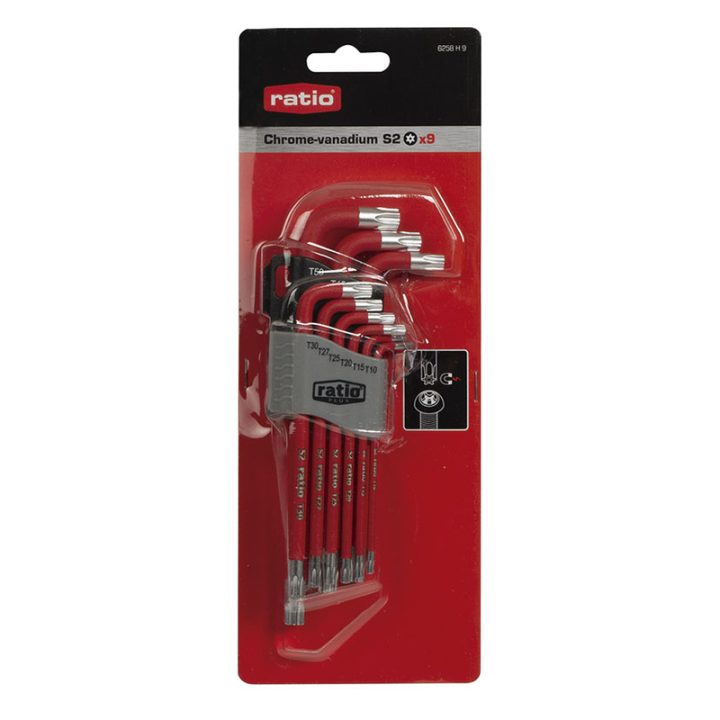 A diferencia de las llaves Allen, las llaves Torx cuentan con una barra circular en lugar de hexagonal y extremos en forma de estrella de seis puntas. Por su diseño, los tornillos de cabeza Torx resisten muy bien el efecto cam-out, es decir, que la varilla del destornillador resbale o se deslice indeseadamente del tornillo. Este juego de 9 llaves Torx Seguridad de la marca RATIO destaca por su resistencia y excelente calidad de cada una de sus piezas con punta magnética y diferentes medidas (T-10-15-20-25-27-30-40-45-50). Las llaves están confeccionadas en acero cromo-vanadio S2 y se presentan en una práctica funda antideslizante con soporte trasero para llevar en el cinturón. Se presenta en un blíster.