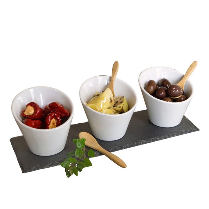 Este juego es perfecto para completar tu menaje, lo podrás utilizar en todas las ocasiones por su calidad y elegancia. Está fabricado en cerámica de color blanco con una bandeja de pizarra de 30×10 cm y 3 cucharas de bambú. Los recipientes ovalados son aptos para el lavavajillas y microondas, tienen unas medidas de ø 9×8,3 cm. Viene presentado en una caja.