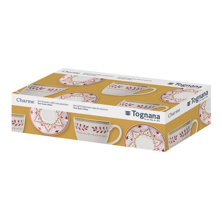Juego de café 6 servicios fabricados en porcelana decorada con cenefa dorada con ramas rojas en fondo blanco con sus correspondientes platos. Las tazas tienen una capacidad de 20 cl. Puedes combinarlo con el resto de productos que tenemos de esta misma serie.
