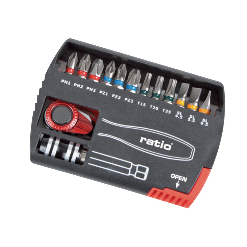El juego es compacto y permite tener las puntas perfectamente ordenadas y dispuestas siempre para su uso. Producto muy completo, de gran calidad, indispensable para cualquier profesional que quiera ganar tiempo y ahorrar en esfuerzos innecesarios a la hora de atornillar cualquier material. Se presenta en un blíster de 14 unidades.