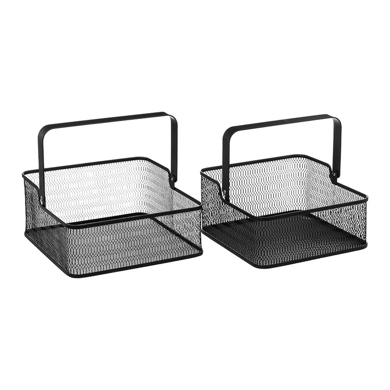 Este juego de 2 cestas está fabricado en metal pintado en color negro, son desmontables y tienen una capacidad de 5 kg por cesto. El juego está compuesto por una cesta de medidas: 23x23xh.11,5 cm y una cesta de 25,5×25,5xh.12 cm.
